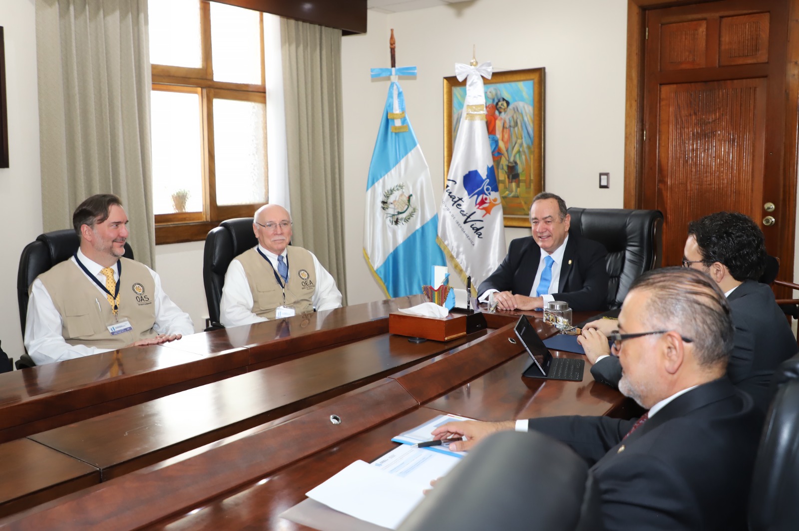 En la reunión en Casa Presidencial participaron, además, el subjefe de la MOE-OEA, Gerardo Sánchez; y el director del Departamento para Cooperación y Observación Electoral de la OEA, Gerardo de Icaza; el embajador de la OEA en Guatemala, Diego Paz, el viceministro de Relaciones Exteriores de Guatemala, Geovani Castillo y el secretario de Comunicación Social de la Presidencia, Kevin López Oliva.