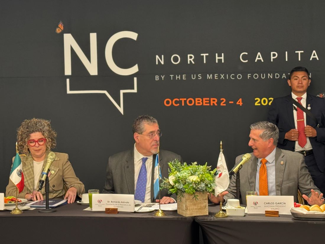 Presidente Bernardo Arévalo acompañado de la Ministra de Economía, Gabriela García, sostuvo una reunión con empresarios de la Cámara de Comercio Americana de México (AMCHAM México, por sus siglas en inglés), en la ciudad mexicana, y entre algunos de los representantes de las empresas que los acompañaron fueron: Meta, Walmart, Apple, General Motors, Fibra Next.