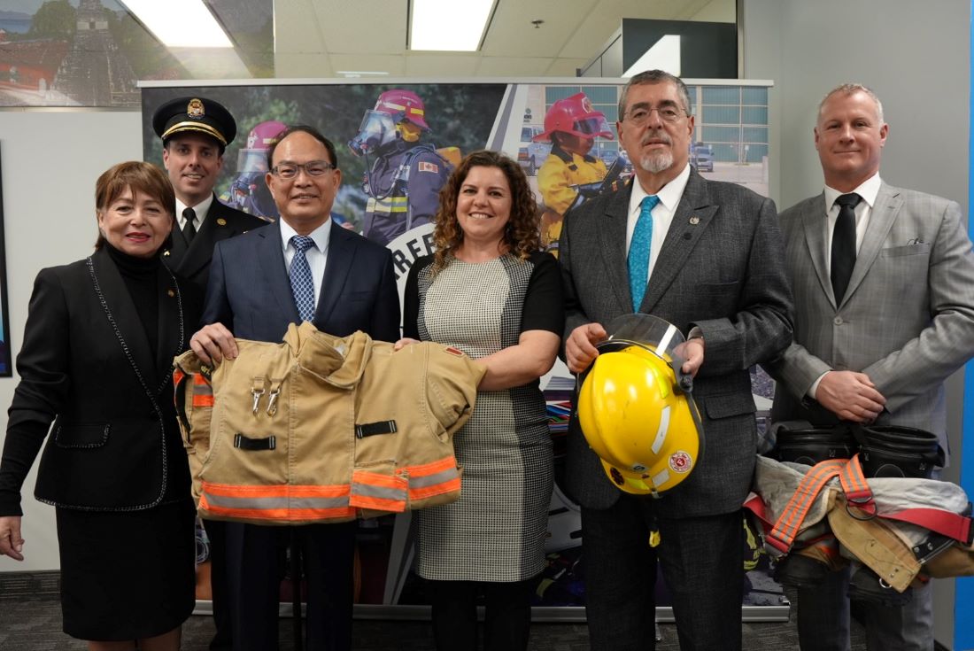 En la entrega de la donación participaron Harry Tseng de la Oficina Económica y Cultural de Taipéi en Canadá, y el vicepresidente Craig Dockeray de la junta de Bomberos Sin Fronteras.