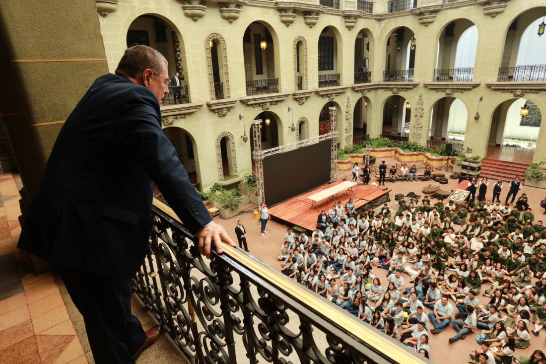 Presidente Bernardo Arévalo saludó a un grupo de estudiantes que visitaron el Patio de La Paz del Palacio Nacional de la Cultura