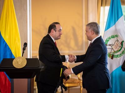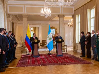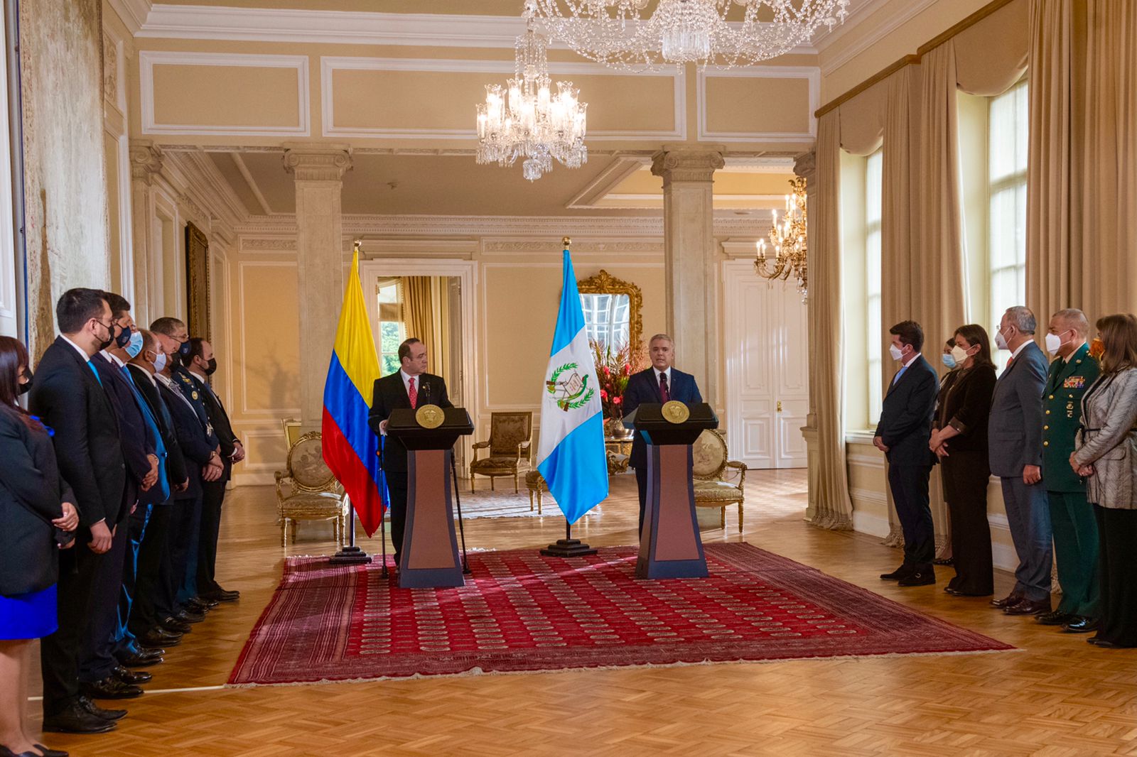 En una declaración conjunta ante medios de comunicación, los presidentes de Guatemala y de Colombia, Iván Duque, expusieron los resultados de las conversaciones sobre la agenda bilateral y regional celebradas en la Casa de Nariño, sede del Gobierno colombiano.