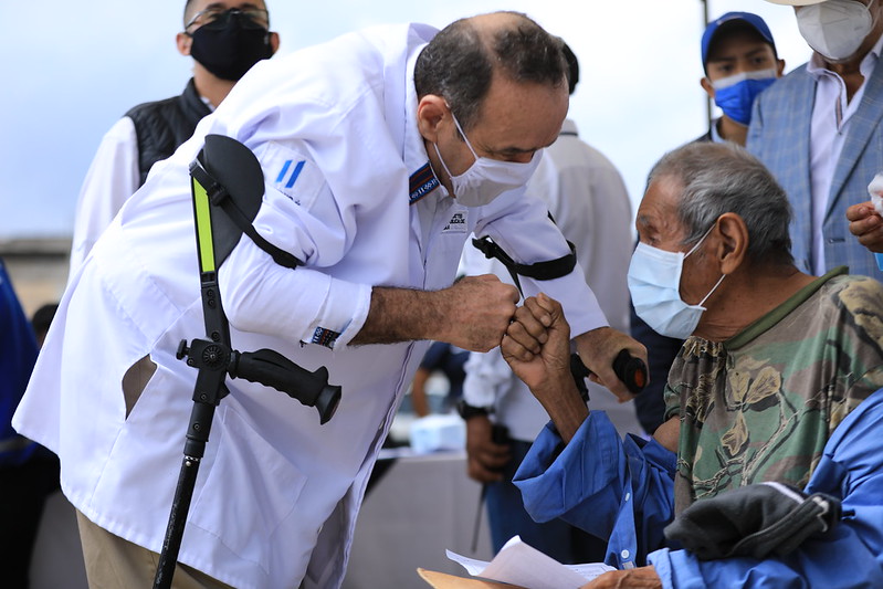 El presidente Giammattei, luego de entregar la Cédula del Aporte Económico del Adulto Mayor a un grupo representativo de 246 beneficiarios, se vistió con la bata de médico y administró la dosis de la vacuna contra el COVID-19 a numerosas personas de la tercera edad que asistieron a la actividad.