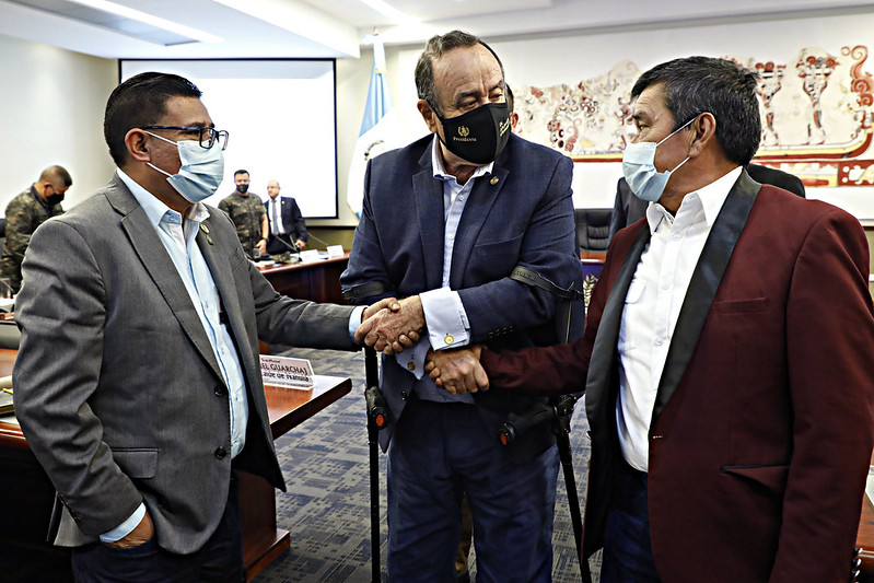 El Presidente Alejandro Giammattei y el Ministro de Gobernación David Napoleón Barrientos en seguimiento a las mesas de diálogo para buscar soluciones al conflicto territorial entre Nahualá y Santa Catarina Ixtahuacán, sostuvieron una reunión con autoridades de ambos municipios, en la cual acordaron darle acompañamiento al Registro de Información Catastral para establecer los límites municipales, además, se adquirió el compromiso de mantener la paz y el orden público respetando el derecho a la vida.