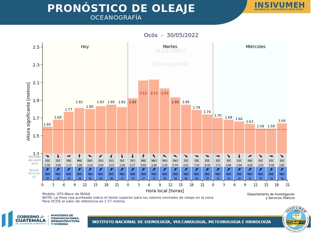 - Miércoles 01 de junio de 2022: Alturas máximas de 1.70 metros, 0.13 metros por arriba del umbral máximo.