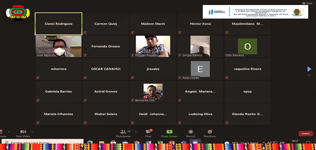 La Comisión Presidencial contra la Discriminación y el Racismo contra los Pueblos Indígenas en Guatemala -CODISRA- participo en la capacitación virtual denominada, ¨Prevención del Racismo y la Discriminación, Racismo Legal y Racismo Institucional¨ brindada a personal de la Dirección General del sistema penitenciario, donde el Comisionado Presidencial Juan Everardo Chuc Xum impartió el tema prevención del Racismo y la Discriminación Racial, mientras que el Comisionado Presidencial Maximiliano Marroquín Feliciano, compartió la capacitación de la Eliminación del Racismo Legal, en el tema del Racismo Institucional la capacitación fue impartida por José Cruz Reinoso Zacarías coordinador del Componente Institucional de CODISRA.