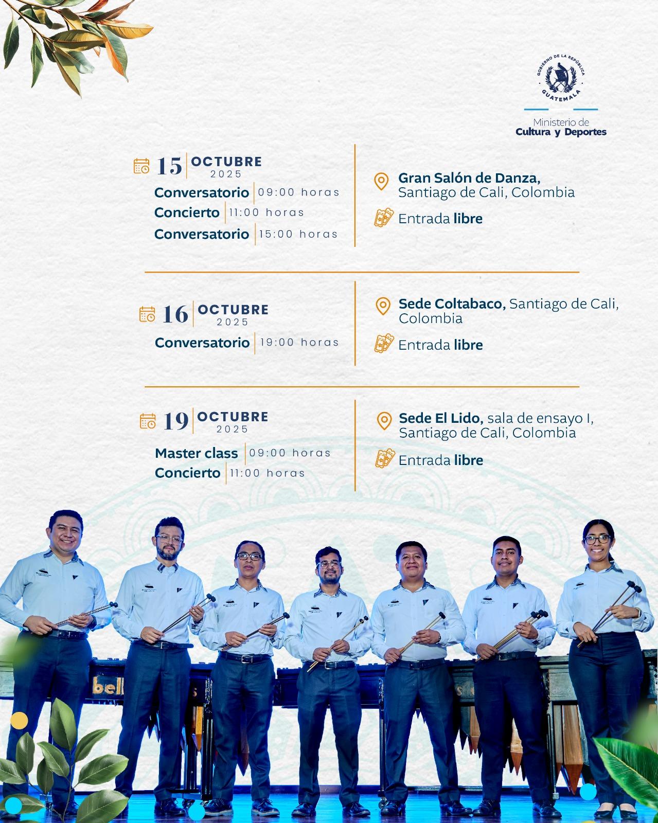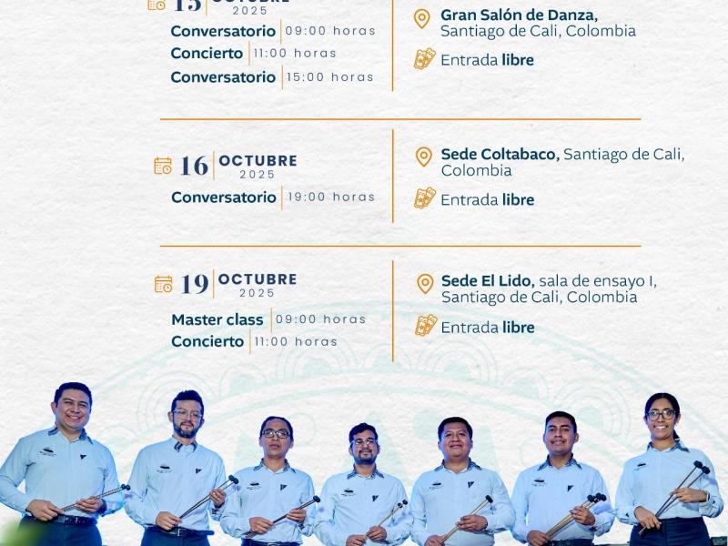 La Marimba de Concierto de Bellas Artes, institución adscrita al Ministerio de Cultura y Deportes, estará en la ciudad de Cali, Colombia, para cumplir un intenso calendario de actividades del 15 al 19 de octubre de 2025.