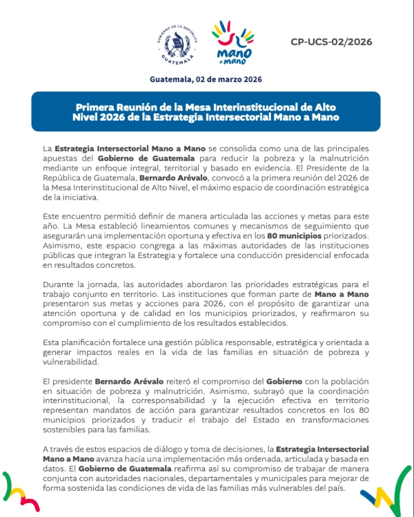 Primera Reunión de la Mesa Interinstitucional de Alto Nivel 2026 de la Estrategia Intersectorial Mano a Mano