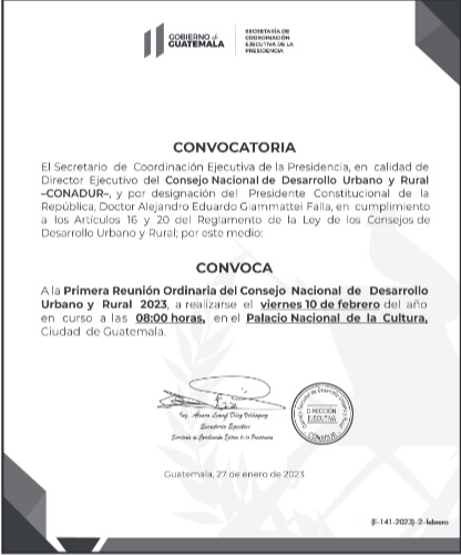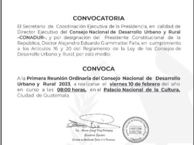 Guatemala, 2 de febrero de 2023. La primera reunión ordinaria del Consejo Nacional de Desarrollo Urbano y Rural (Conadur) de este año se realizará el próximo viernes 10 de febrero, en el Salón Banderas del Palacio Nacional de la Cultura.