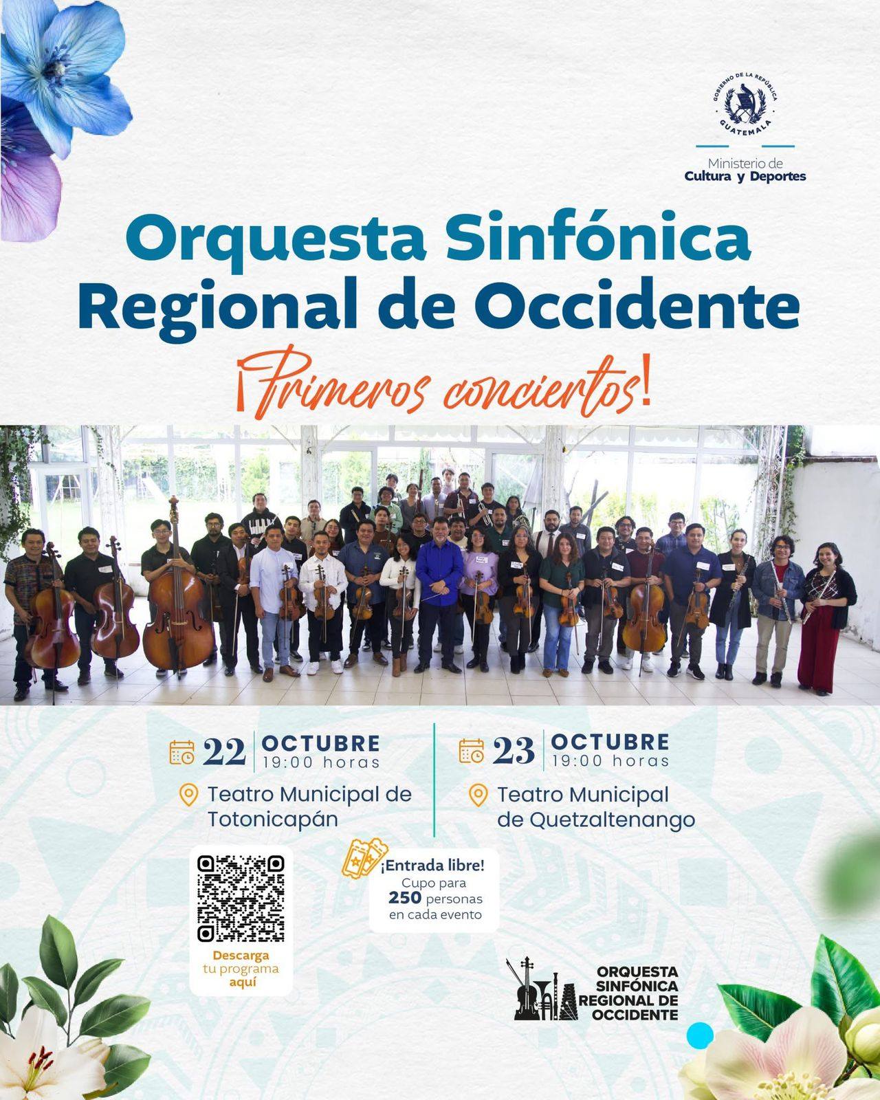 El Ministerio de Cultura y Deportes (MCD) apoya el debut de la Orquesta Sinfónica Regional de Occidente, un proyecto reciente que busca difundir la música clásica en el occidente de Guatemala. Esta iniciativa, formalizada en 2025 bajo el Acuerdo Ministerial 508-2025, celebra sus primeros conciertos con entrada gratuita para acercar la cultura a la comunidad.