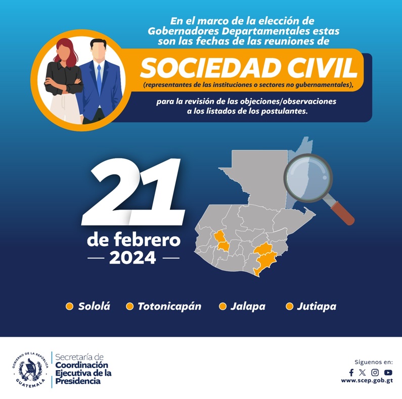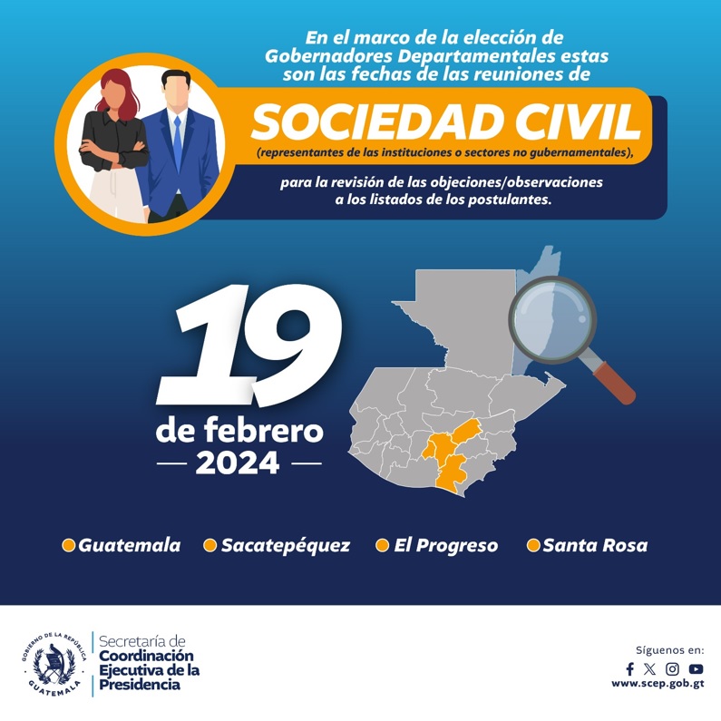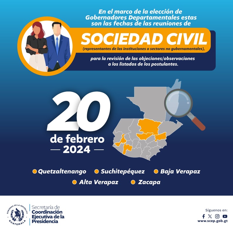 Estas acciones dan continuidad al proceso de elección, normado a través de la Convocatoria para proponer ternas para Gobernadores Departamentales, publicada el 29 de enero en el Diario Oficial y fundamentada en los artículos: 183, 227 y 228 de la Constitución Política de la República de Guatemala;42 de la Ley del Organismo Ejecutivo; 9 último párrafo y 10 literal k) de la Ley de los Consejos de Desarrollo