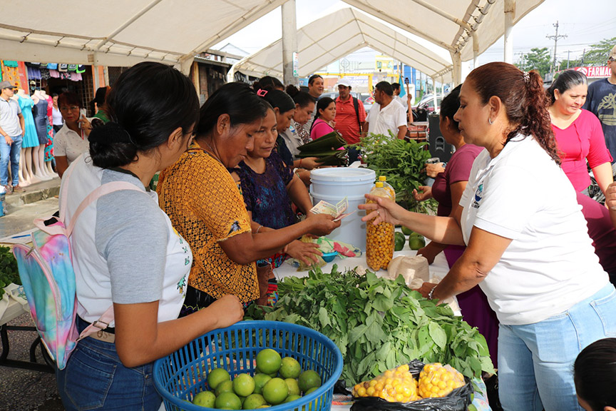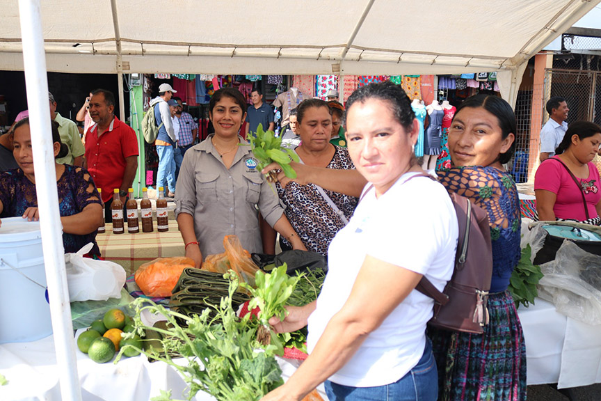 Entre los productos comercializados figuran: frijol, harina de ramón, yuca, macal, plátano, aguacate, miel, pollo, queso, frutas, y hierbas como mora, chaya, orégano, alcapa (también conocido en otras regiones como como samat), además de semillas, conservas y platillos típicos elaborados con base en productos orgánicos.