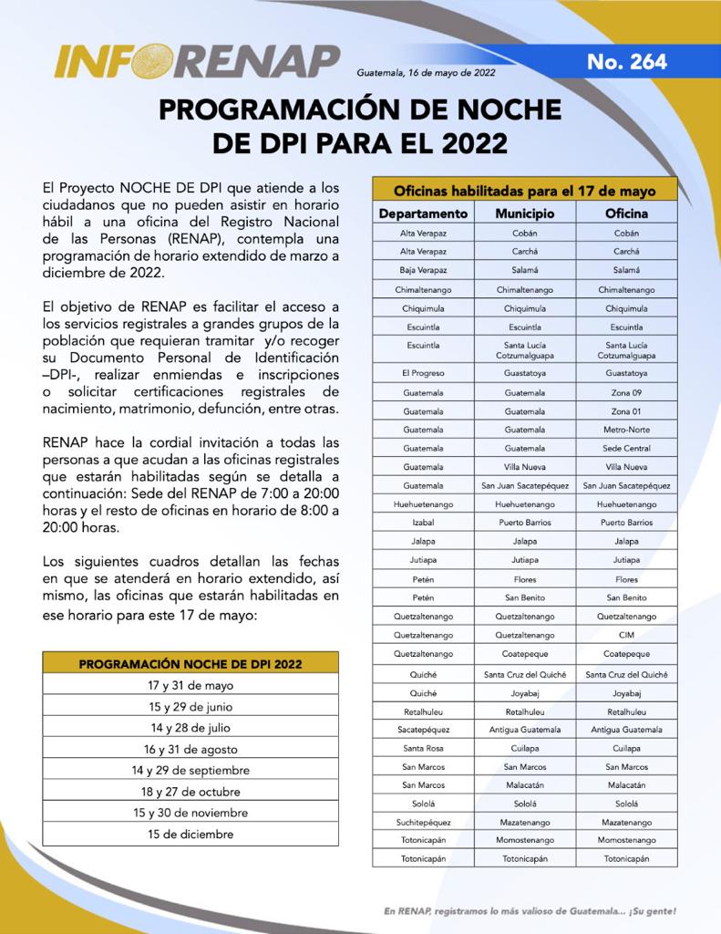 El proyecto NOCHE DE DPI que atiende a los ciudadanos que no pueden asistir en horario hábil a una oficina del Registro Nacional de las Personas (RENAP), contempla una programación de horario extendido de marzo a diciembre del 2022.
