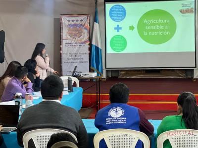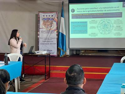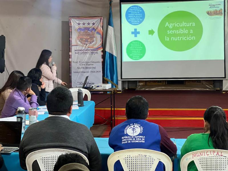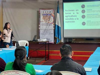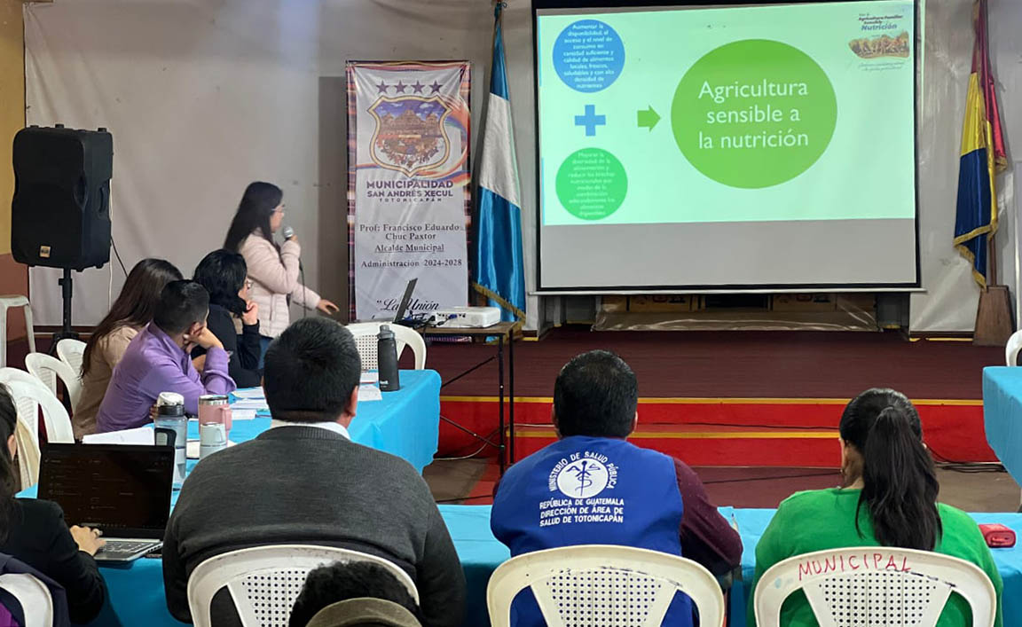 También se expusieron las acciones desarrolladas en el municipio por medio del trabajo de la nutricionista de Agricultura Sensible a la Nutrición del MAGA, en coordinación con la Agencia Municipal de Extensión Rural (AMER), SESAN y el MSPAS. Estas acciones llevan prácticos a las comunidades, fomentan la producción de alimentos diversos y promueven prácticas agrícolas saludables y sostenibles.