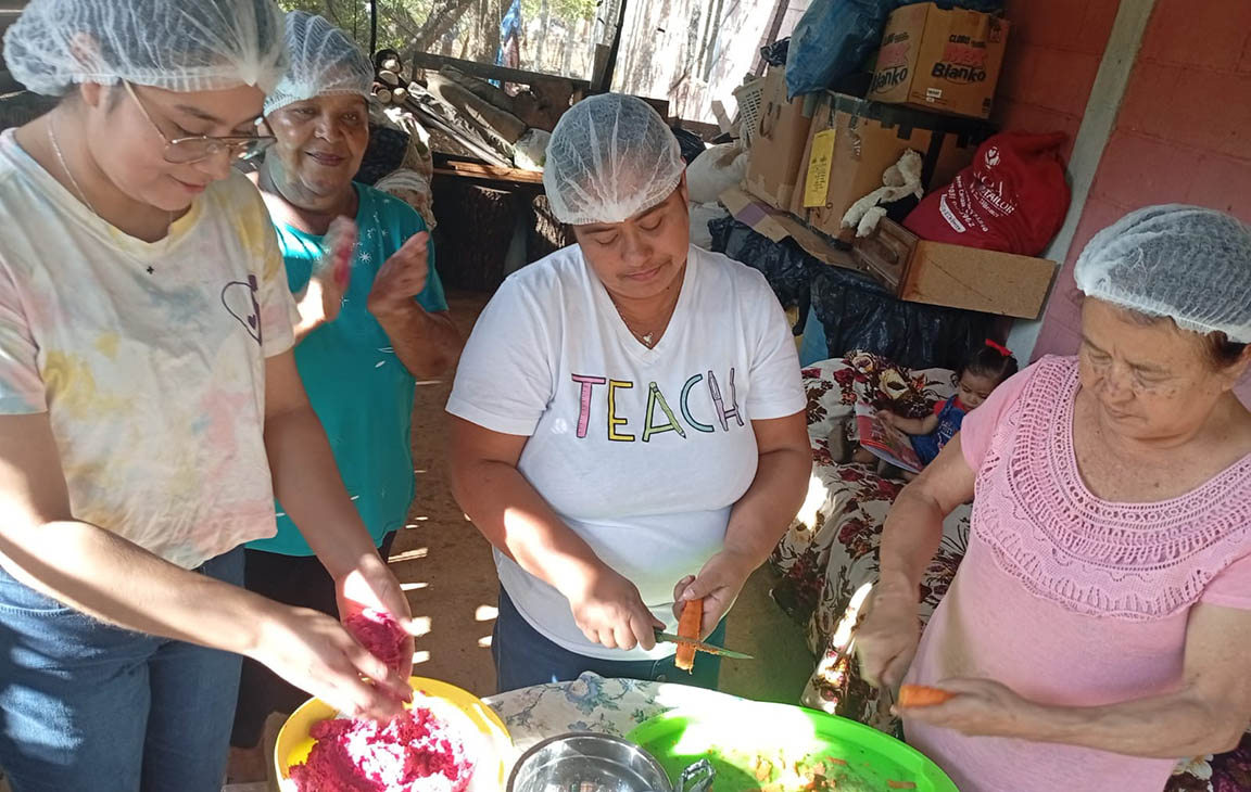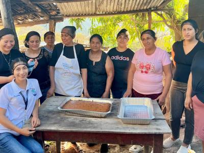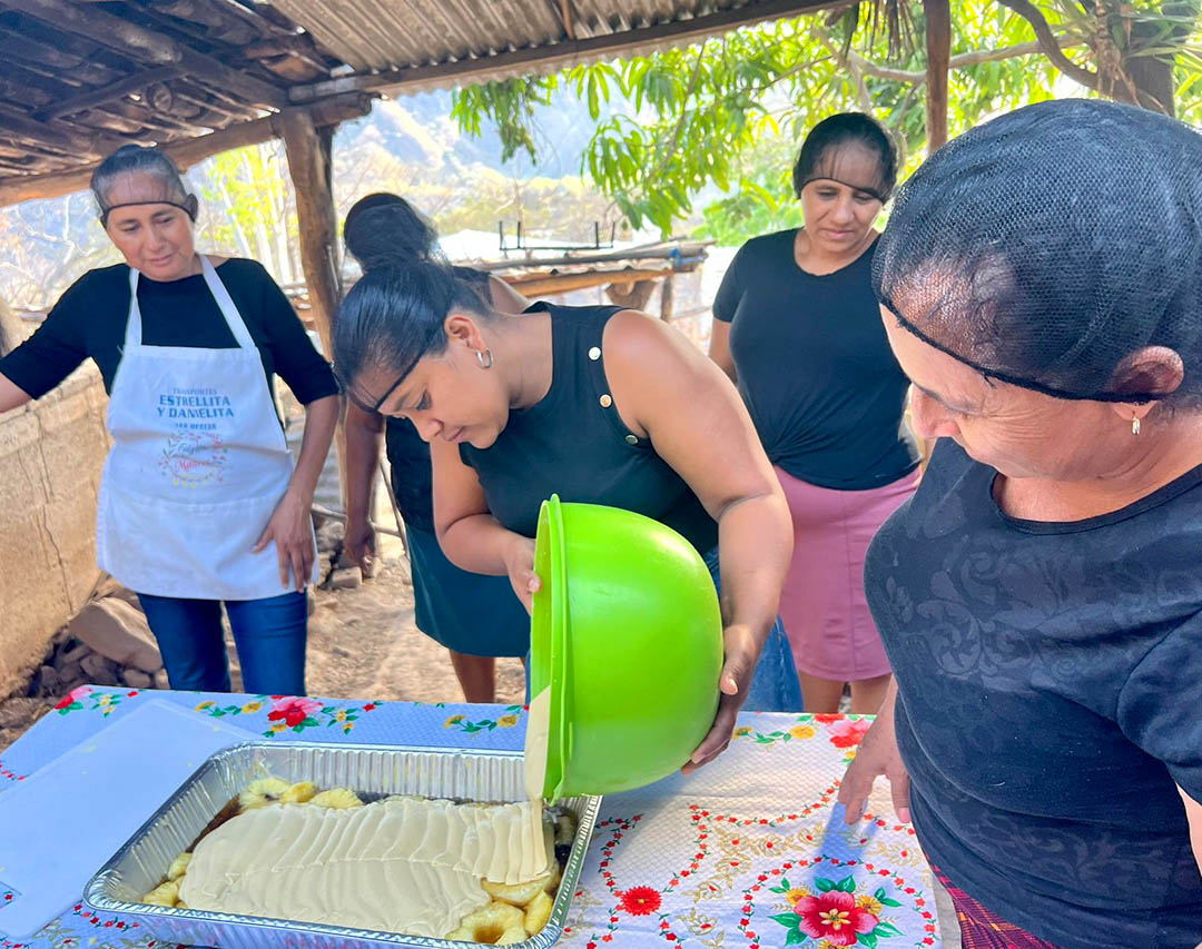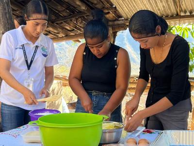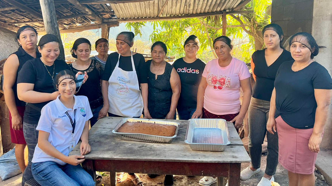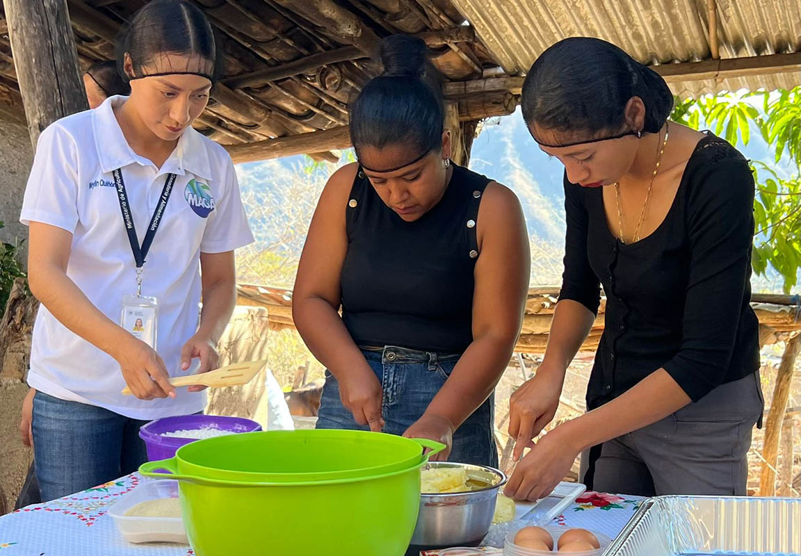 Asimismo, en la comunidad de San Luis Ilopango, municipio de Zapotitlán, se realizó un taller de transformación de frutas para el emprendimiento. Las beneficiarias aprendieron la elaboración de pan o volteado de piña, un proceso que permite dar valor agregado a las frutas de temporada, mejorando no solo la nutrición del hogar, sino también abriendo oportunidades para la generación de ingresos extras mediante la repostería artesanal.