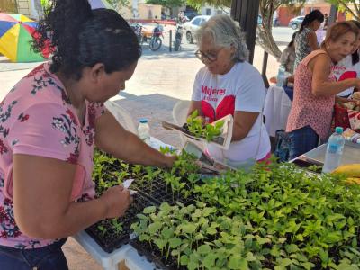 Las participantes ofrecieron diversos productos elaborados artesanalmente, como lociones, jabones, desodorantes, pan y miel, así como pilones de pepino y chile producidos en sus huertos.