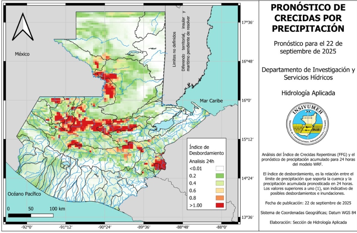 Pronóstico de Crecidas por Precipitación. Pronóstico de Crecidas por Precipitación para 24 horas, 48 horas y 72 horas, correspondiente al 22 de septiembre de 2025. Enlace de consulta: https://insivumeh.gob.gt/?p=65911