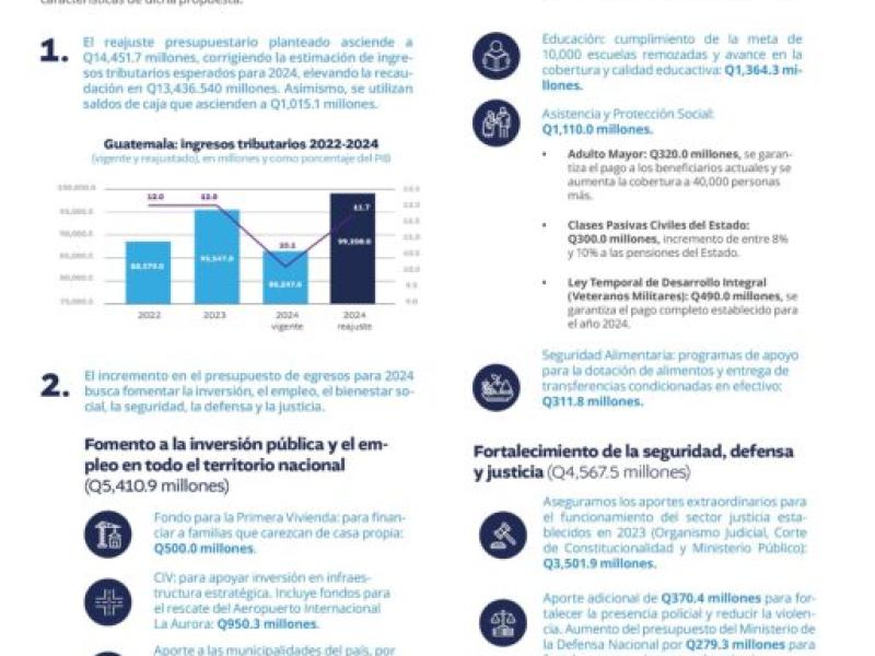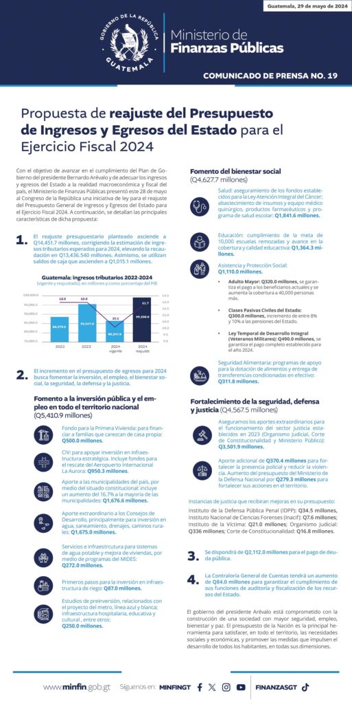 Con el objetivo de avanzar en el cumplimiento del Plan de Gobierno del presidente Bernardo Arévalo y de adecuar los ingresos y egresos del Estado a la realidad macroeconómica y fiscal del país, el Ministerio de Finanzas Públicas presentó el 28 de mayo al Congreso de la República una iniciativa de ley para el reajuste del Presupuesto General de Ingresos y Egresos del Estado para el Ejercicio Fiscal 2024.