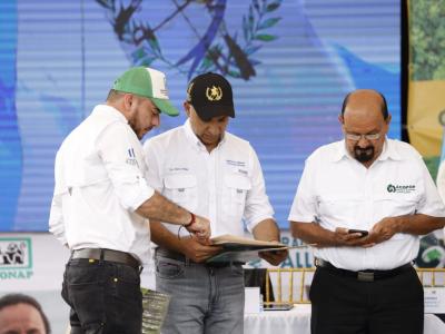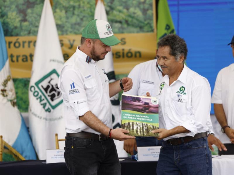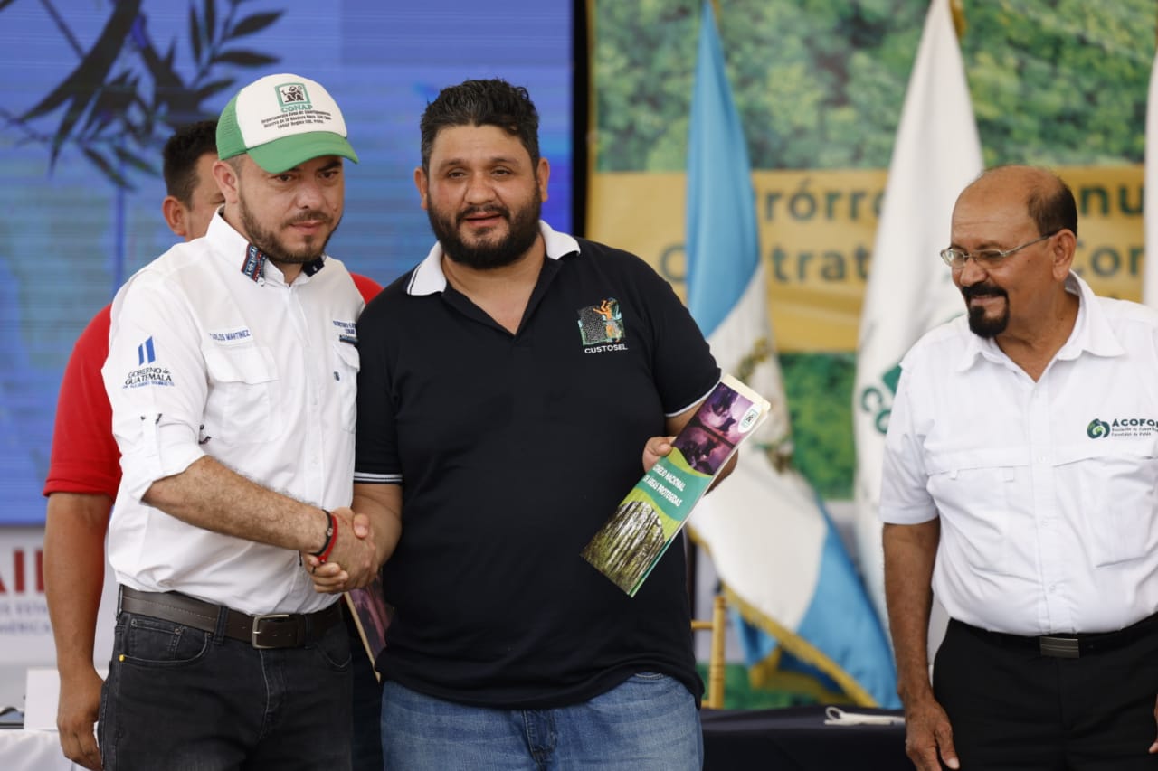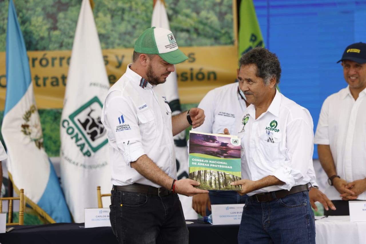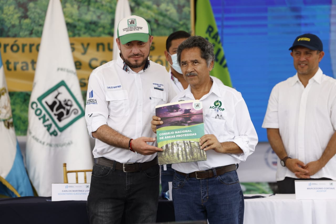 En ese marco el Secretario Ejecutivo del Consejo Nacional de Áreas Protegidas -CONAP-, Carlos Martínez López hizo entrega de 3 Contratos de Prórroga de Concesión Forestal por 25 años más a las Unidades de Manejo La Unión, Yaloch y la Gloria, además concedió 2 nuevos contratos de Concesión Forestal Comunitaria por 30 años, a las Unidades de Manejo San Bartolo y La Colorada - El Molino, en la ZUM, RBM.