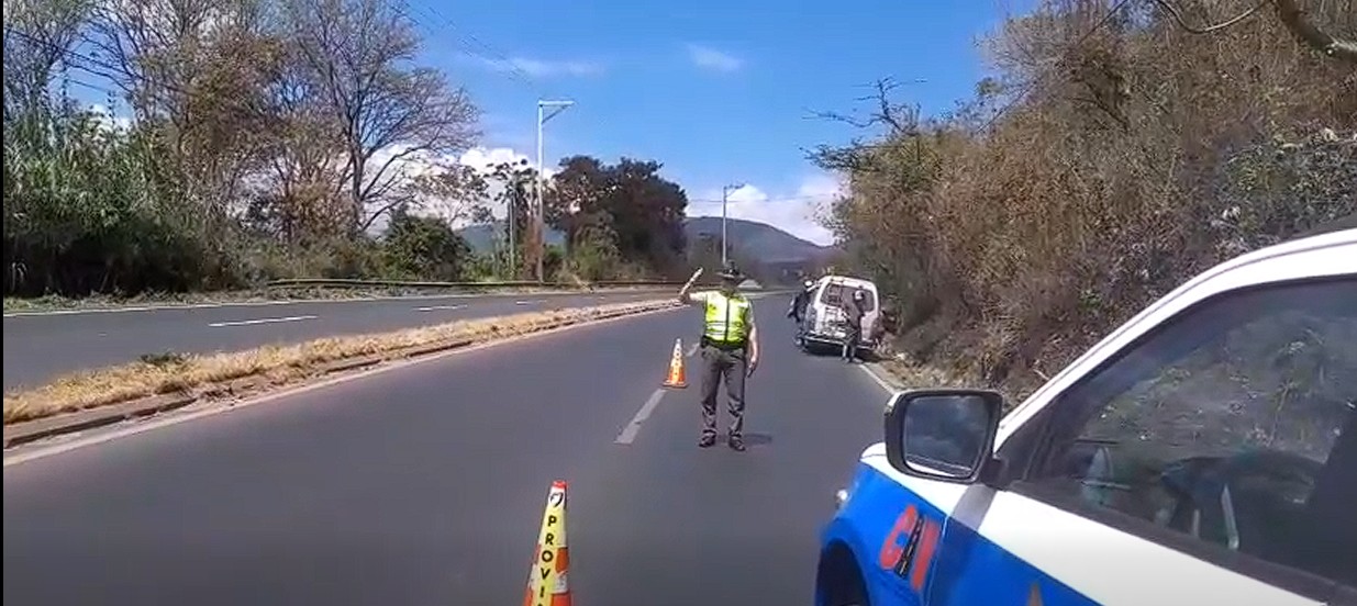 Brigadas de la Dirección General de Protección y Seguridad Vial (Provial) brindan asistencia vial a conductor de microbús varado por desperfectos mecánicos en el km 35 de carretera a El Salvador [CA-1 Oriente], en Fraijanes, Guatemala. Obstruye el carril derecho hacia occidente.