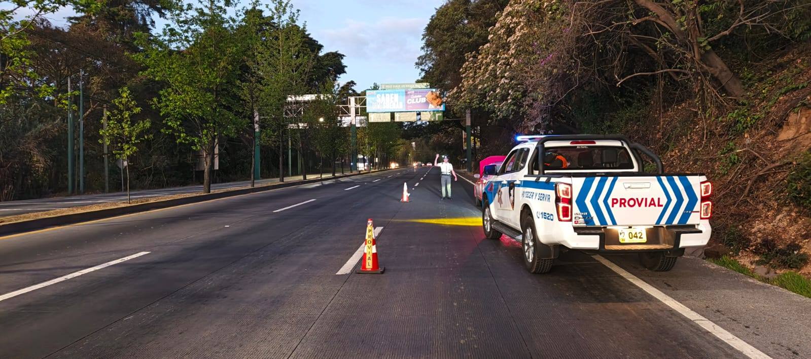 Brigadas de la Dirección General de Protección y Seguridad Vial (Provial) dan asistencia vial al conductor de un vehículo varado por sobrecalentamiento en el Km 25 de la ruta Interamericana [CA-1 Occidente], en jurisdicción de Mixco, Guatemala. Obstruye el carril derecho hacia occidente.