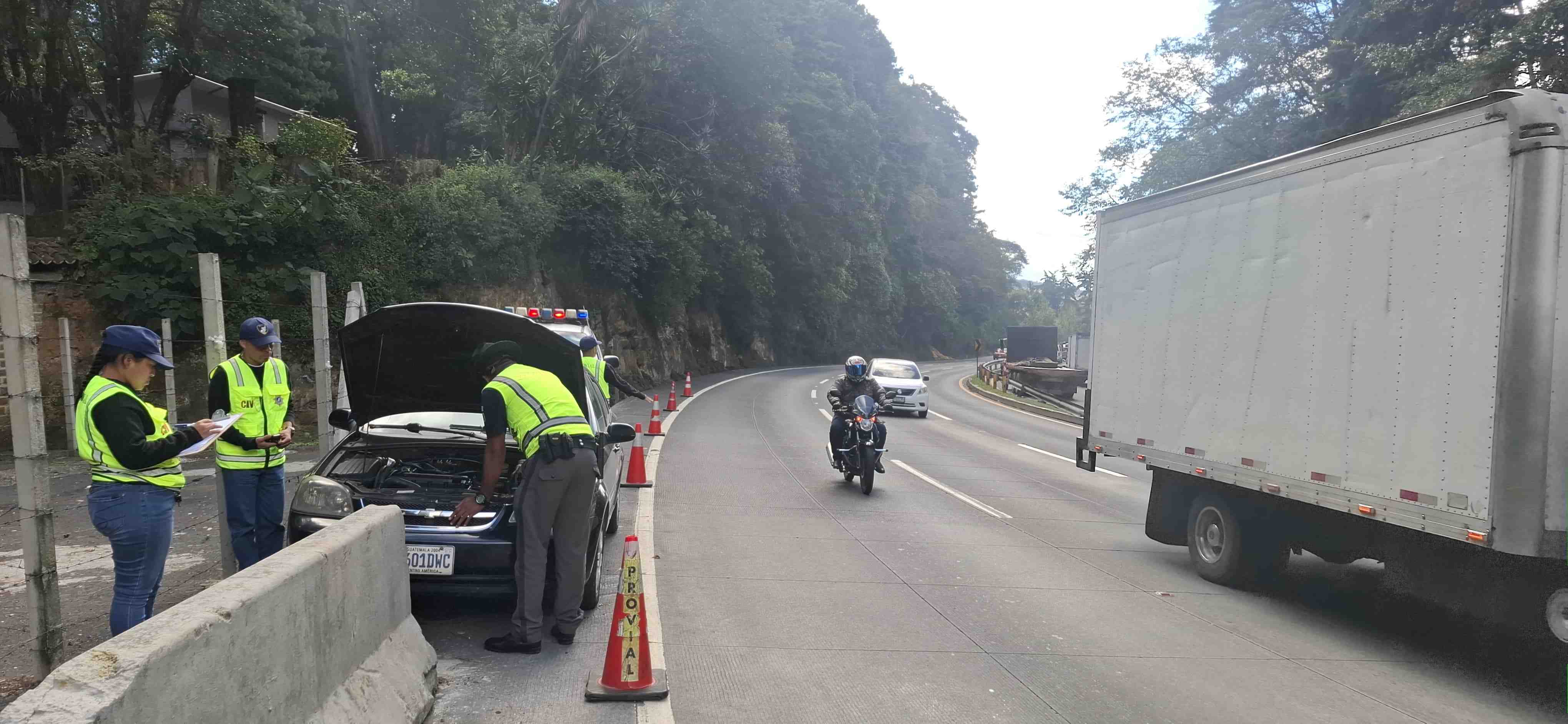 La Dirección General de Protección y Seguridad Vial (PROVIAL), del Ministerio de Comunicaciones, Infraestructura y Vivienda (CIV), atendió un vehículo tipo sedán que presentó fallas mecánicas en el kilómetro 22.2 de la ruta Interamericana (CA-1 Occidente), en jurisdicción de Mixco, Guatemala.