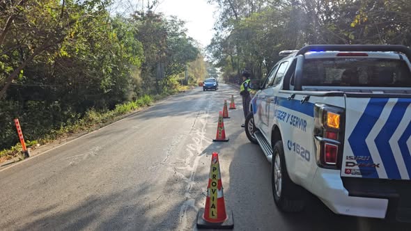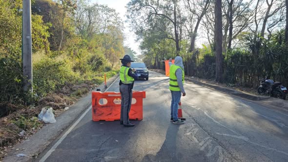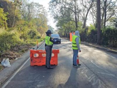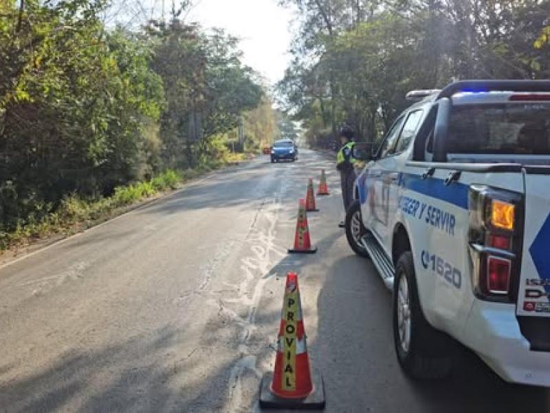 Brigadas de la Dirección General de Protección y Seguridad Vial (Provial) apoyan en regulación vehicular en el km. 67.8 de Ruta Nacional 16, en la ruta de Cuilapa a Chiquimulilla, donde se alterna el paso de vehículos en un paso paralelo construido por la Unidad Ejecutora de Conservación Vial (COVIAL), debido al cierre de la carretera principal.