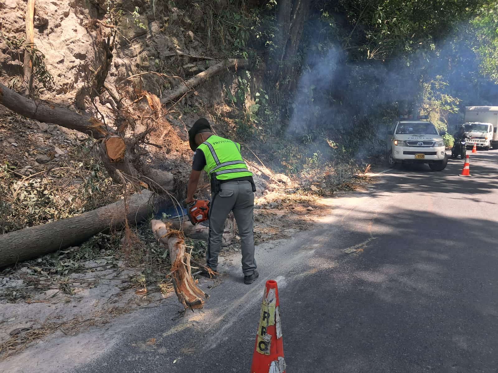 Brigadas de la Dirección General de Protección y Seguridad Vial (Provial) brindan seguridad vial y realizan trabajo de limpieza por caída de árbol en el km 198 de la ruta CITO-180, en El Palmar, Quetzaltenango. Obstruye el carril hacia el sur y se alterna el paso.