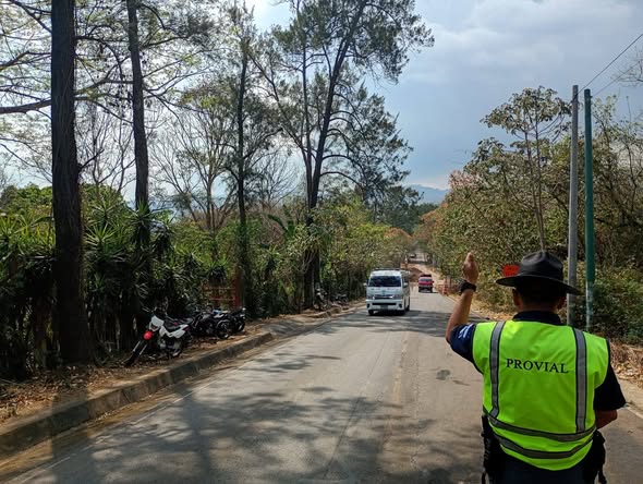 Brigadas de la Dirección General de Protección y Seguridad Vial (Provial) brindan seguridad vial debido a trabajos en carretera en el km 67.8 de la Ruta Nacional 16, en jurisdicción de Cuilapa, Santa Rosa, donde se alterna el paso de vehículos.