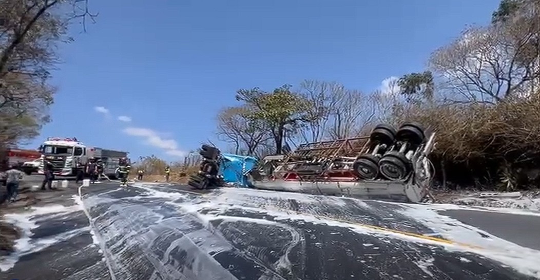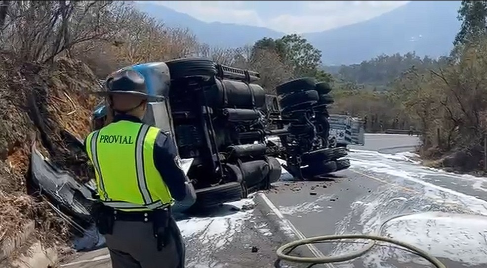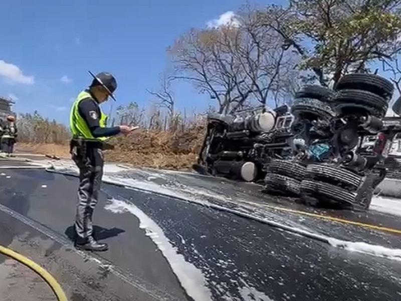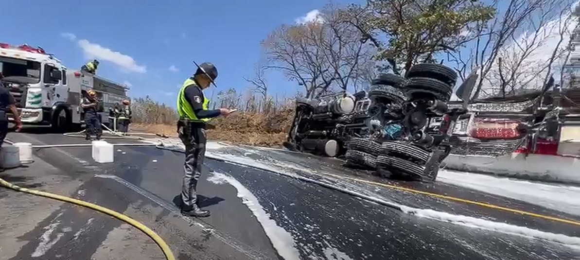 Brigadas de la Dirección General de Protección y Seguridad Vial (Provial) atienden hecho de tránsito en el km 70 de la Ruta Nacional 14, en jurisdicción de Pastores, Sacatepéquez, donde volcó un cabezal, lo que mantuvo obstruido el paso vehicular en ambos sentidos, por lo que se reguló el tránsito, el cual se complicó debido al derrame de combustible.