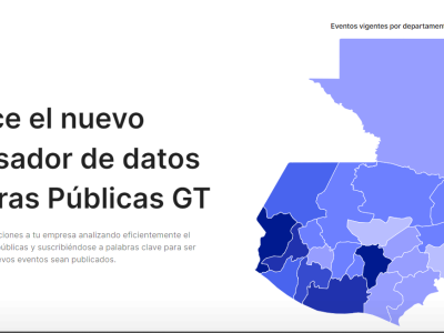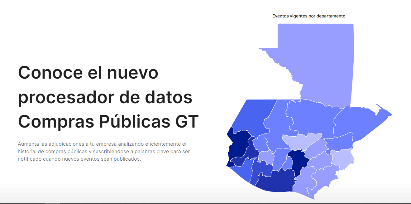 Compras Públicas GT es un procesador de la plataforma de Guatecompras que aumenta las posibilidades de adjudicaciones a las empresas analizando eficientemente el historial de compras públicas y suscribiéndose a palabras clave para ser notificado cuando nuevos eventos sean publicados.