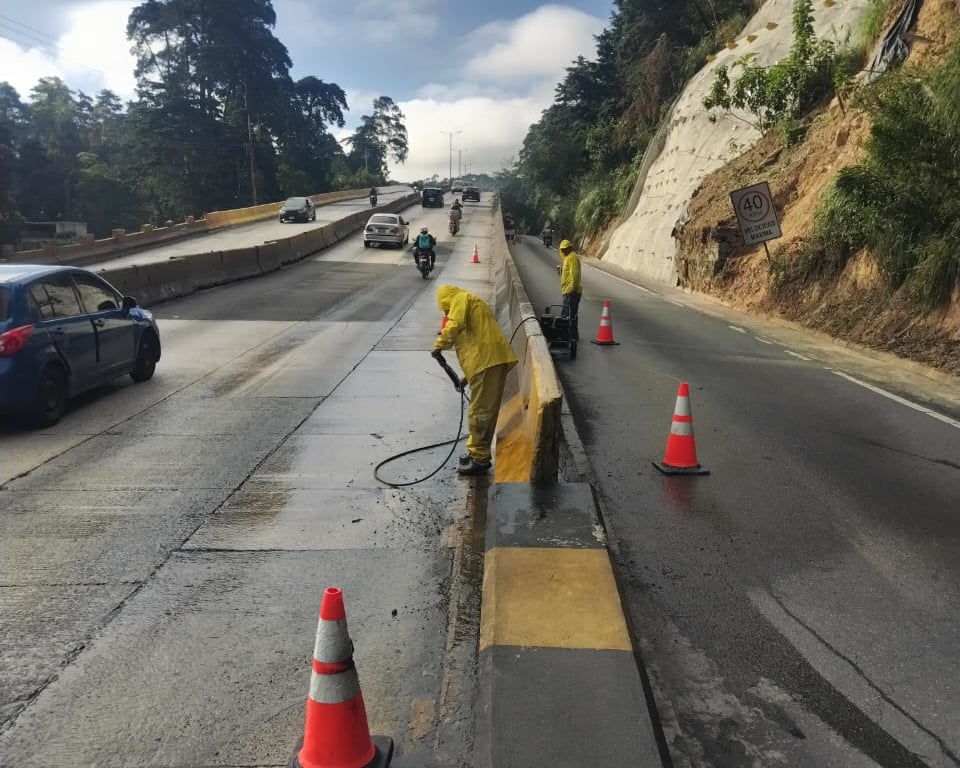 En el kilómetro 12.5 de la CA-01 Oriente continúa la atención preventiva al paso a desnivel Santa Rosalía. Las cuadrillas realizan limpieza y pintura en barandas y elementos estructurales. Se recomienda conducir con precaución, ya que hay personal trabajando en la zona.