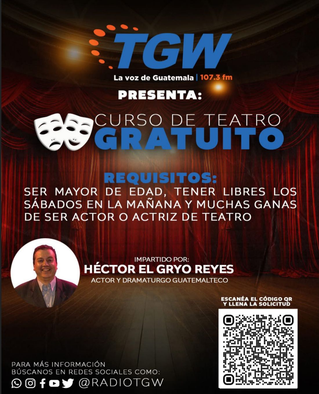 Si siempre has querido subirte a un escenario o explorar tu lado artístico, esta es tu oportunidad. Radio TGW invita al público guatemalteco a participar en un curso gratuito de teatro, impartido por el reconocido dramaturgo Héctor “El Gryo” Reyes.