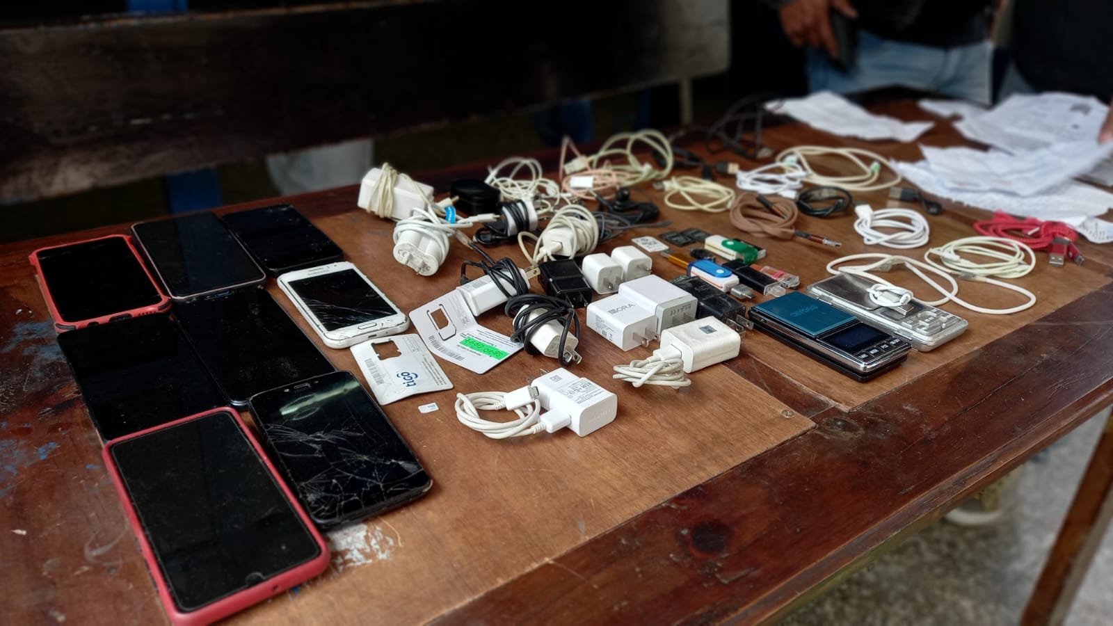 Como resultado de la acción policial se localizaron 8 teléfonos celulares, cargadores, dos pesas electrónicas, cables y adaptadores USB. También, objetos punzocortantes y tres router.