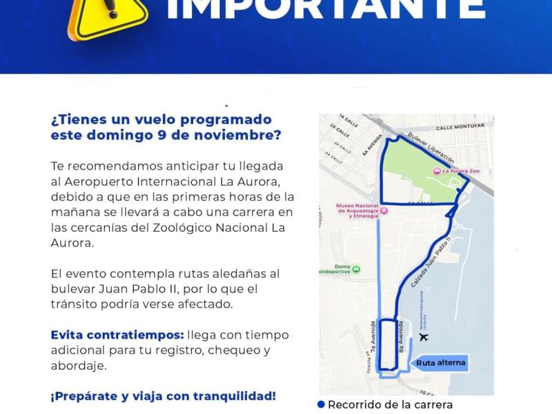 La Dirección General de Aeronáutica Civil (DGAC) informa a la población que este domingo 9 de noviembre, debido a una carrera organizada por el Zoológico Nacional La Aurora, podría presentarse congestionamiento vehicular en las zonas aledañas al Aeropuerto Internacional La Aurora (AILA).