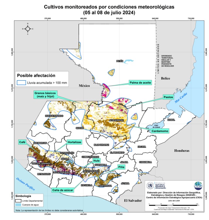 El monitoreo constante se mantiene en 241 municipios más vulnerables, de los departamentos de Alta Verapaz, Huehuetenango, Quiché, Petén, San Marcos y Quetzaltenango. Los cultivos que se encuentran más expuestos se encuentran: maíz, frijol, café y cardamomo.