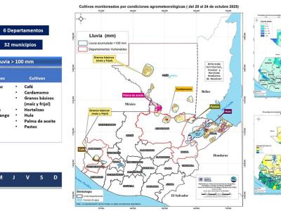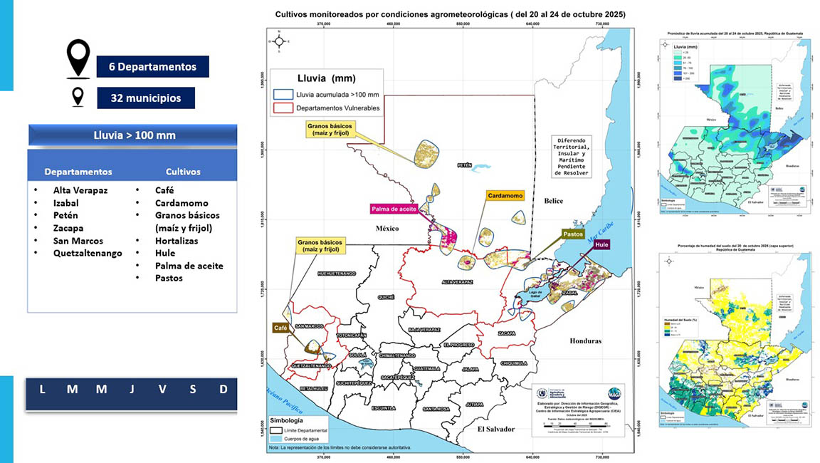Según los reportes técnicos del Instituto Nacional de Vulcanología, Meteorología e Hidrología (INSIVUMEH), las lluvias han superado los 100 milímetros en varias regiones, situación que genera condiciones que afectan los cultivos, el ganado y la producción acuícola. Esta situación obliga a mantener un monitoreo constante en seis departamentos y 32 municipios, así como orientar a los productores para que apliquen medidas preventivas para la continuidad de la producción agropecuaria nacional.