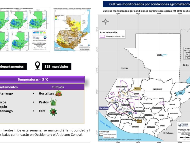 Los cultivos en riesgo incluyen hortalizas, pastos y café, que podrían verse afectados por el frío, por lo que el MAGA mantiene el monitoreo mediante el mapa de cobertura vegetal.
