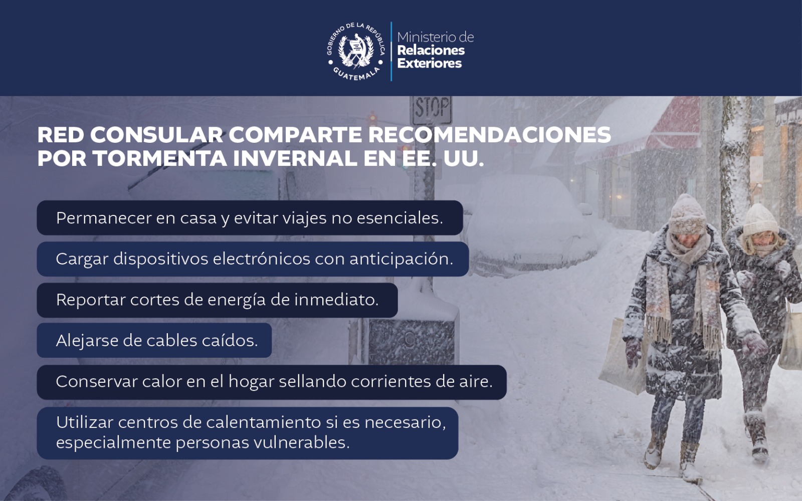 El Ministerio de Relaciones Exteriores, por medio de la Red Consular, reafirma su compromiso de estar en permanente contacto con la comunidad guatemalteca, ofreciendo orientación y apoyo en esta situación climática adversa.