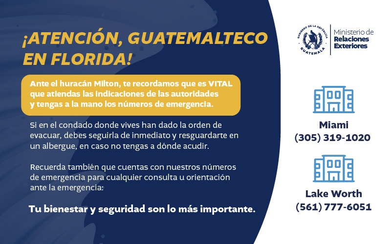 El Ministerio de Relaciones Exteriores, a través de la Red Consular, reitera su compromiso de velar por el bienestar y la seguridad de los guatemaltecos en Florida en situaciones de emergencia.
