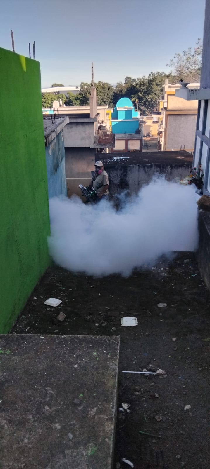 Con el objetivo de prevenir la propagación del dengue, el personal del Departamento de Vectores de la Dirección Departamental de las Redes Integradas de los Servicios de Salud (DDRISS) Guatemala Nor Occidente, realiza jornadas de nebulización (fumigación) y abatización en el Cementerio General de San Juan Sacatepéquez.