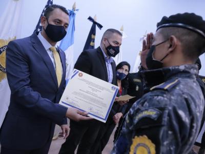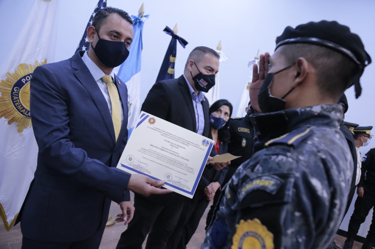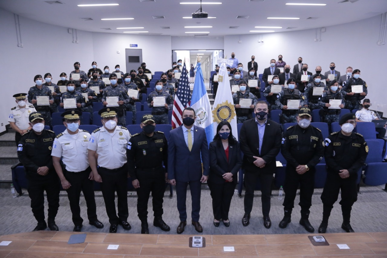 Con la importancia de incrementar mejores controles en los puertos, aeropuertos y fronteras, este día fue clausurada la capacitación para reforzar habilidades y estrategias de inspección en puestos de control y registro, así la culminación de Actualización del Reglamento Operativo de la Unidad Móvil de Interdicción Táctica” (UMIT), por el Quinto Viceministro de Gobernación, Fernando Manolo Rodas, mandos de Policía Nacional Civil (PNC), representantes de la Dirección de Aduanas y Protección Fronteriza (CBP) de la Embajada de Estados Unidos, en la Escuela de Especialidades de Policía, zona 6.