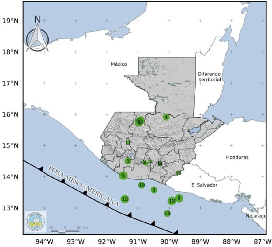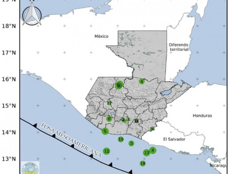 El INSIVUMEH, como ente científico del Sistema de la Coordinadora Nacional para la Reducción de Desastres -CONRED-, indicó, a través de su boletín, las regiones epicentrales de los movimientos telúricos, siendo las siguientes: departamentos de Guatemala, Sacatepéquez, Alta Verapaz, Suchitepéquez, Totonicapán, Santa Rosa (2), Escuintla (2) y Quiché (2); océano Pacífico (3); océano Pacífico-costas de Santa Rosa, de El Salvador y de Escuintla, como también territorio de El Salvador.