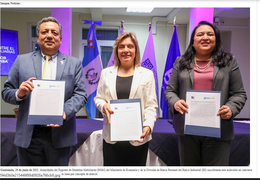 Autoridades del Registro de Garantías Mobiliarias (RGM) del Ministerio de Economía y de la División de Banca Personal del Banco Industrial (BI) suscribieron este miércoles un convenio que pondrá en marcha la modalidad para hacer pagos en línea por concepto de arancel.