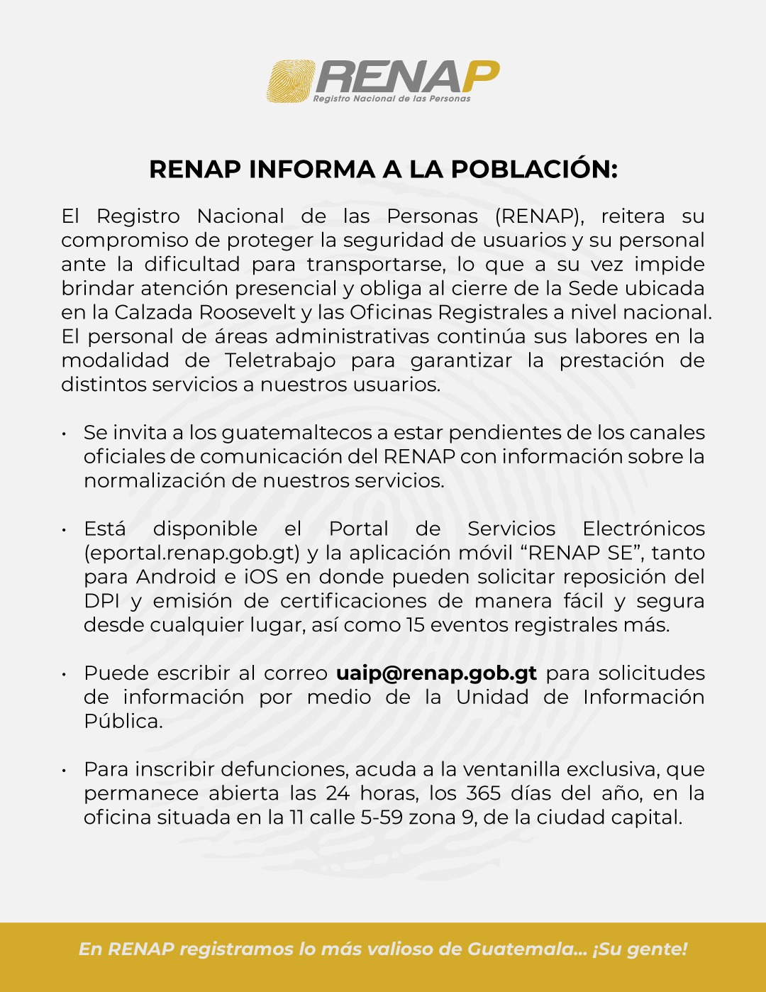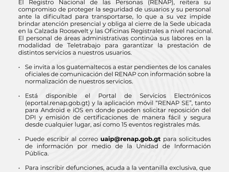 El Registro Nacional de las Personas (RENAP), reitera su compromiso de proteger la seguridad de usuarios y su personal ante la dificultad para transportarse, lo que a su vez impide brindar atención presencial y obliga al cierre de la Sede ubicada en la Calzada Roosevelt y las Oficinas Registrales a nivel nacional.