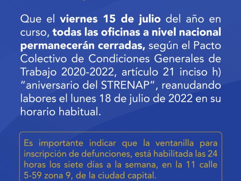 Que el viernes 15 de julio del año en curso, todas las oficinas a nivel nacional permanecerán cerradas, según el Pacto Colectivo de Condiciones Generales de Trabajo 2020-2022, artículo 21 inciso h) "aniversario del STRENAP" reanudando labores el lunes 18 de julio de 2022 en su horario habitual.