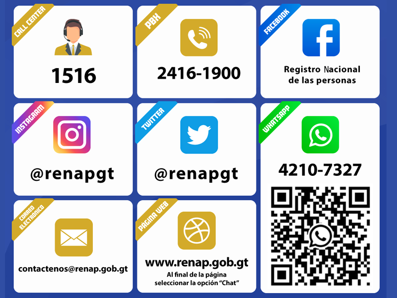 Para atender a los ciudadanos de forma directa, el Registro Nacional de las Personas -RENAP-, pone a disposición de la población diversas vías de comunicación para interactuar con el Centro de Información, en los que encontrará solución y orientación a sus consultas registrales, brindadas por un equipo de profesionales con amplios conocimientos.