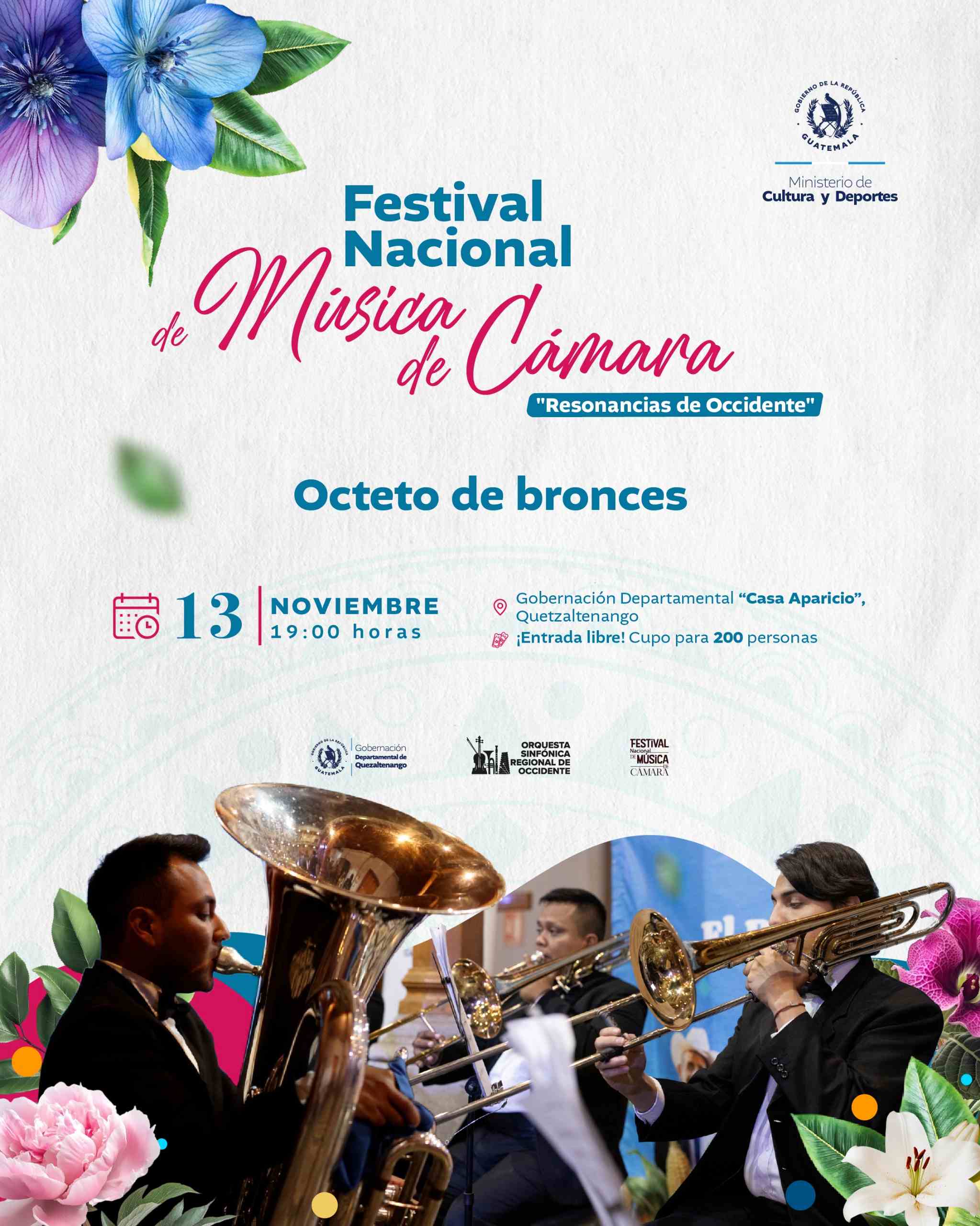 El Ministerio de Cultura y Deportes presenta el 13 de noviembre a las 19 horas en la Gobernación Departamental de Quetzaltenango “Casa Aparicio”, el Festival de Música de Cámara, “Resonancias de Occidente”, octeto de bronces. ¡Entrada libre! Cupo para 200 personas.