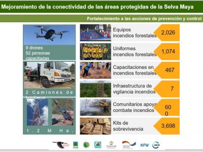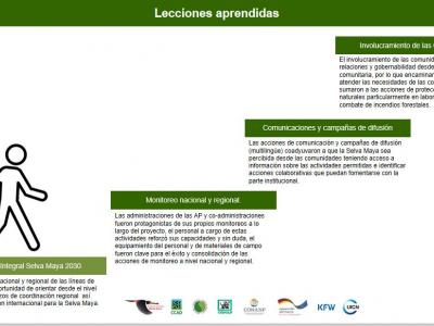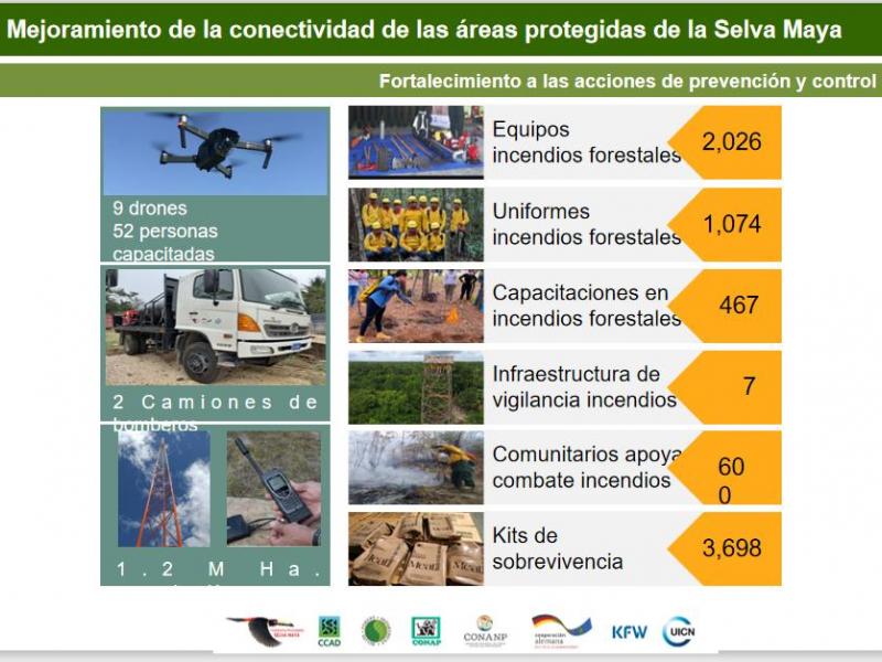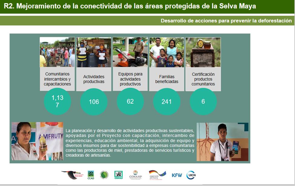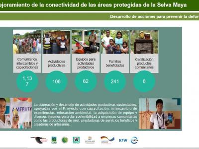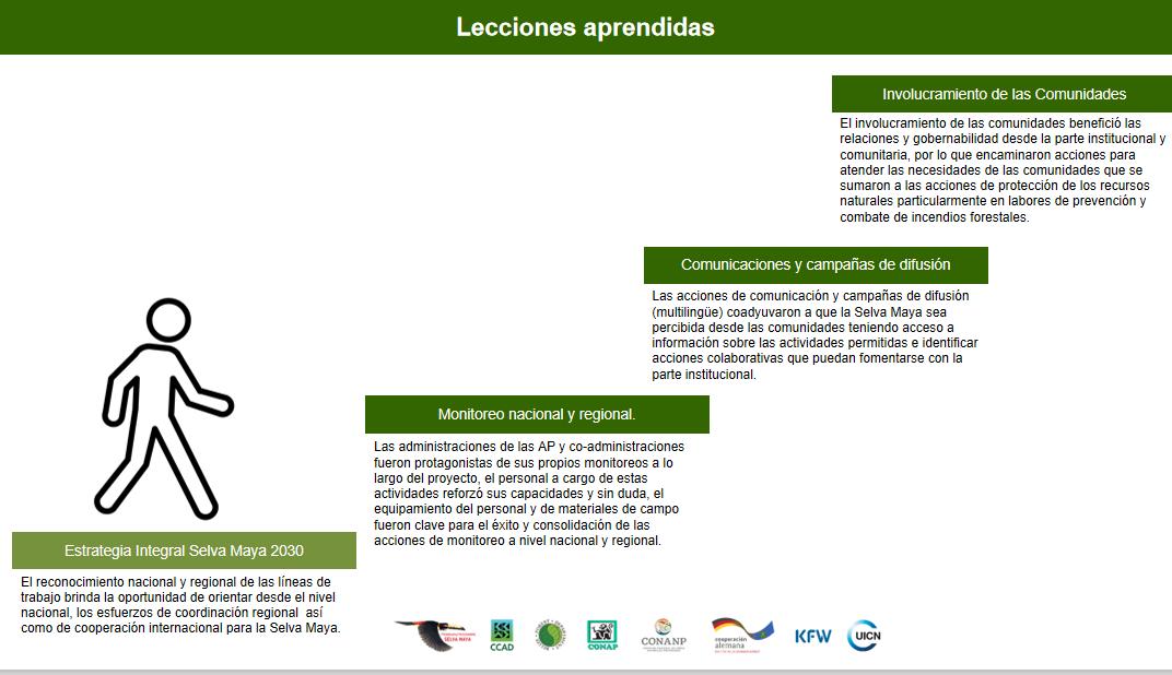 El Proyecto deja aportes importantes para las áreas protegidas, su conectividad, las comunidades locales y la gobernanza de la Selva Maya. Cabe destacar que se realizó inversión y fortalecimiento en, equipamiento, infraestructura en áreas protegidas priorizadas, herramientas e instrumentos para la gestión y efectividad de manejo de las Áreas Protegidas (AP), la conectividad; así como el fortalecimiento de la capacidad de trabajo y estructura de gobernanza del Grupo Estratégico de Coordinación de la Selva Maya (GEC).