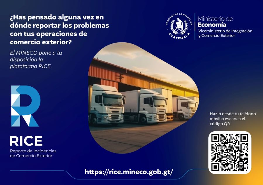 Las empresas, agentes aduanales o importadores, entre otros usuarios, ahora tienen acceso a un lugar en donde informar sobre incidencias al momento de realizar una operación relacionada con el comercio exterior con la plataforma para el Reporte de Incidencias de Comercio Exterior (RICE). (https://rice.mineco.gob.gt/welcome).