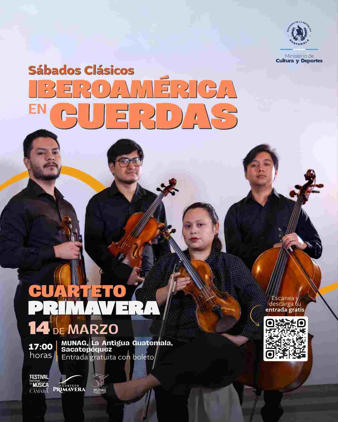 Sábados Clásicos a cargo del Cuarteto Primavera llega al MUNAG, en La Antigua Guatemala, Sacatepéquez. Vive en esta edición una propuesta sonora de diferentes latitudes con obras como: “Danzas Latinoamericanas” de José L. Elizondo, “Fuga y misterio” de Astor Piazzolla y “Estrellita” de Manuel Ponce, entre otras.